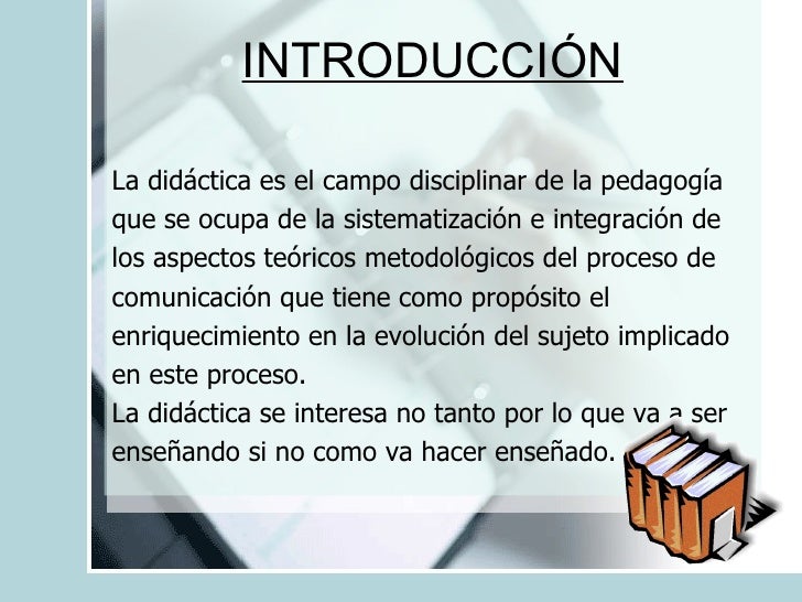 No diferencia los campos de conocimiento niveles de la educacion edades o tipos de conocimientos. OBJETIVO ESPECÍFICO Enumerar las dimensiones en que se basa la didáctica en la educación. Mencionar los problemas que persiguen a la didáctica en la actualidad Enfocar la relación que. Los límites devienen de la amplitud y complejidad de las personas en el proceso de interacción docente-discente del continuo avance y especialización. La didáctica General necesita demarcarse e integrarse reencontrando el valor global y holístico de su objeto pero ampliando los marcos y apoyándose positivamente en otros emergentes derivados de las didácticas específicas. Cuando se habla y se escribe sobre medios técnicas y recursos didácticos se olvida generalmente la pizarra como si fuera la pariente pobre o peor aún la olvidada.